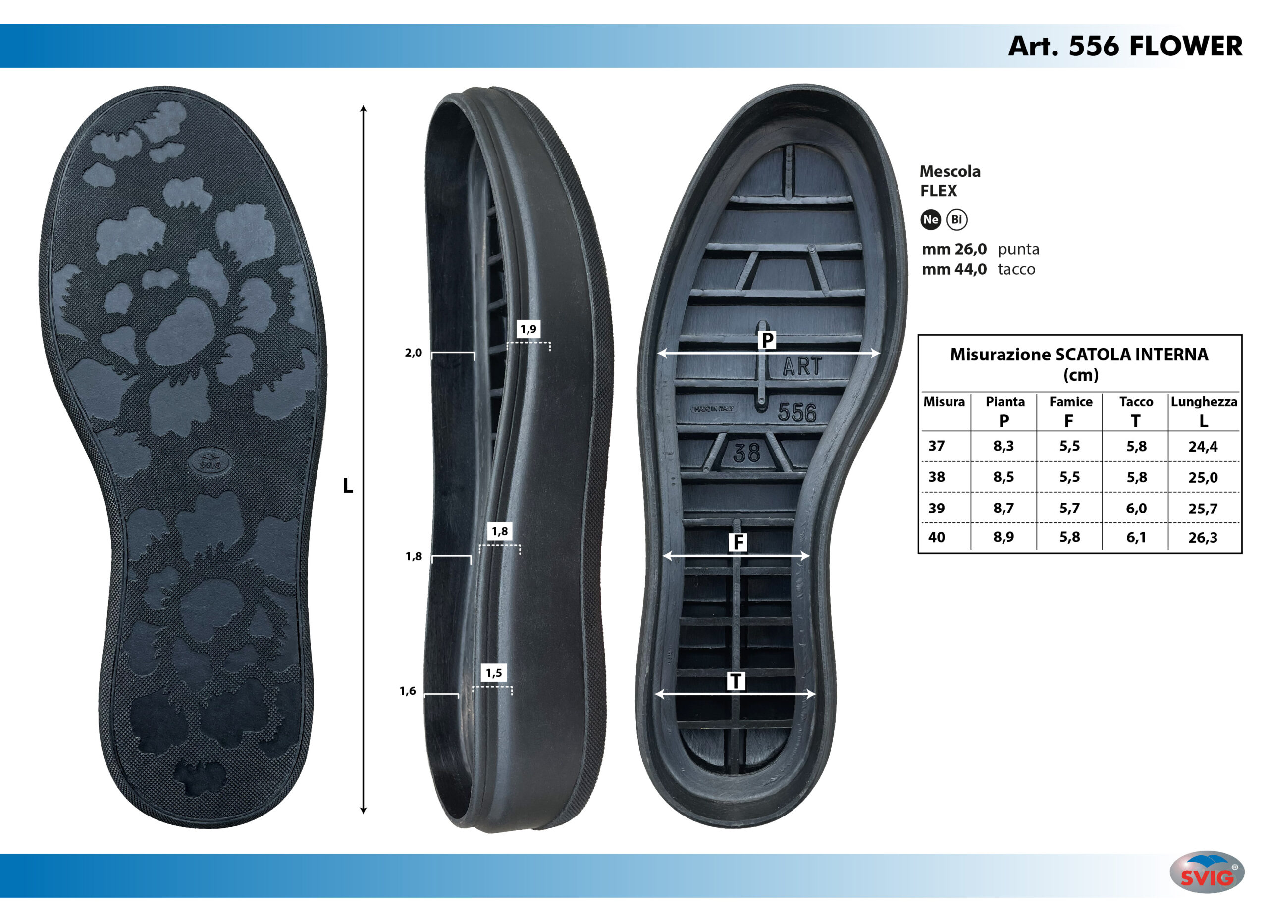 Suola ad incasso in gomma; flessibile, leggera e facilmente incollabile.